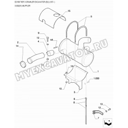 1. 87534195 MUFFLER 2. 87534197 TUBE, RIGID 3. 87534200 BRACKET 4. 72204526 CLIP, HOSE, ASSY 5. 87534202 U-BOLT 6. 154204110 CLAMP 7. 87536553 CLIP 8. 72204524 HOSE, FLEXIBLE 10. 16100821 NUT, M8, Cl 10 11. 11701721 NUT, M10, Cl 10 12. 14496631 WASHER, M10x21x2 13. 11106034 BOLT, Hex, M10x20, 10.9, ..