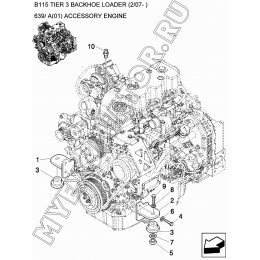 1. 87407275 MOUNT, ENGINE 2. 87368320 MOUNT, ENGINE 3. 87416966 ISOLATOR 4. 11112421 BOLT, Hex, M12x30, 8.8 5. 16105011 NUT, LOCK, M12x1.25 6. 47048976 WASHER, M12 7. 85801585 WASHER, SEALING, 65mm OD 8. 85802618 WASHER, SEALING 9. 87410647 SCREW, M12x1.25x90 10. 87539936 SPACER 11. 87016893 FITTING..