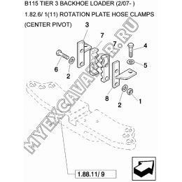 1. 14048221 NUT, LOCK, M8x1.25, Cl 10 2. 12647121 WASHER, M8x20x3 3. 85804573 SUPPORT 4. 11106221 BOLT, Hex, M10x25, 8.8, Full Thd 5. 11190579 WASHER, SPRING, Belleville, M10.5 6. 16044421 BOLT, Hex, M8x60, 8.8 7. 87631460 CLAMP 8. 85804574 SUPPORT..