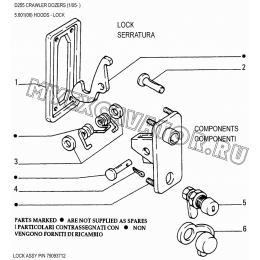 79093712 LOCK ASSY 1. 79102817 GASKET 2. 79090916 PIN 3. 12648301 WASHER, M10x17x1.5 4. 10734301 PIN, SPLIT (COTTER), M2x18 5. 79076867 LOCK, CYLINDER 6. 79091287 PLUG..