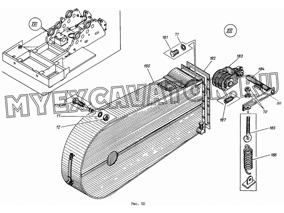80. 23360.2-10x8x50 Шпонка 179 7798.М8x30 Болт 181 7798.М10x16 Болт 182 ЭО-4112.20.00.00.018 Прокладка 183 ЭО-4112.20.09.00.000 Ролик натяжной 184 ЭО-4112.20.50.00.000 Рычаг 185 652.131.01.4 Болт 186 652.131.01.3 Пружина 187 1476.М8x14 Винт